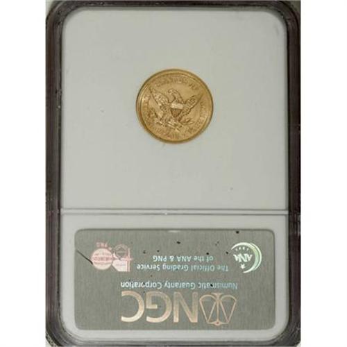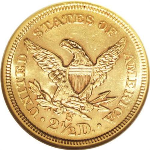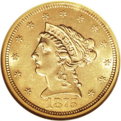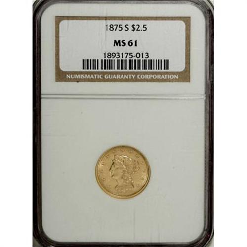 <B>1875-S $2 1/2 MS61 NGC.</B></I> This piece displays satiny luster with attractive brassy-gold color. A few light, scattered abrasions are noted on each side, though a number of these are wispy and the overall eye appeal is suggestive of a finer grade. A pleasing example of this low-mintage issue, which originally consisted of 11,600 pieces. Census: 20 in 61, 8 finer (8/07).<BR><BR><B>Coin Engraver:</B> Christian Gobrecht<BR><BR><b>Shipping:</b> Coins & Currency (<a target="_blank" href="http://www.heritageauctions.com/common/shipping.php">view shipping information</a>)