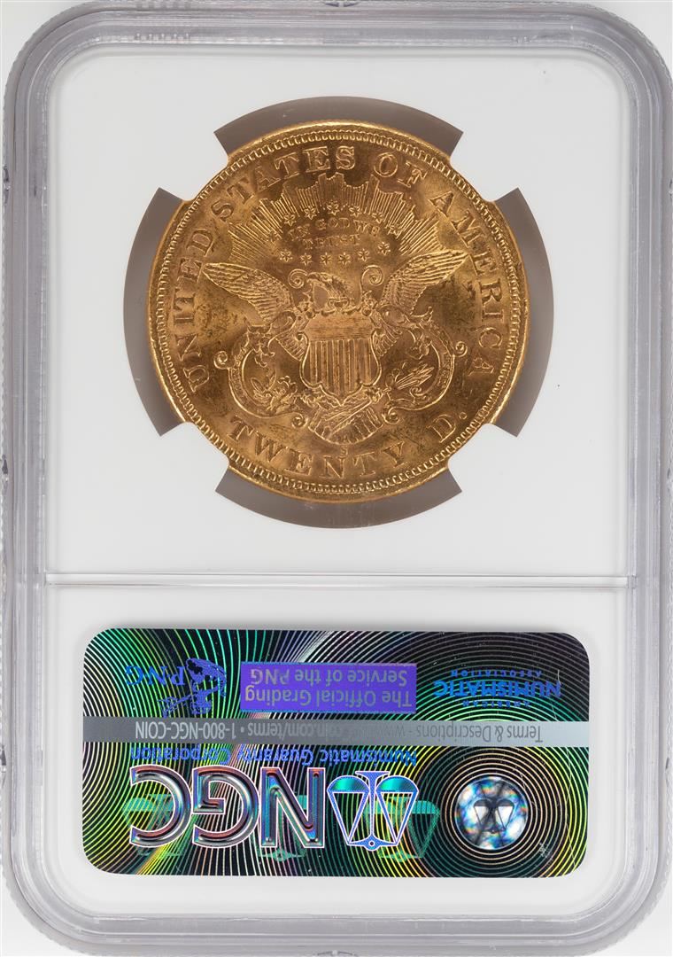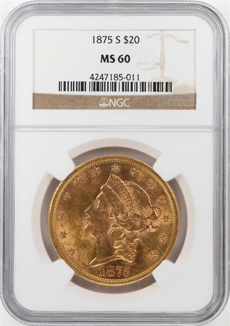 One 1875-S $20 Liberty Head Double Eagle Gold Coin NGC MS60. NGC Certified.