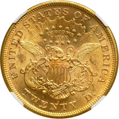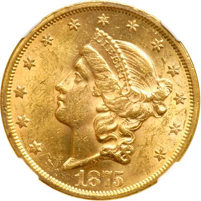 1875-S $20 Liberty. NGC graded MS-61. Light golden color with pinkish tint from the copper alloy. America's gold coins contain 90% gold and 10% copper (for wearability in circulation). This alloy sometimes lends a nice natural tint to the coin. 1875 was the year of the Specie Resumption Act, which led the country slowly back to a strict gold standard when the gold and currency markets returned to par against one another on January 1, 1879 (PCGS # 8975) .