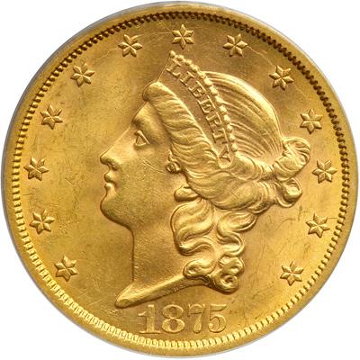 As a design type, the Type 2 Liberty double eagles are clearly the rarest in Mint State grades, followed by the Type 2 issue. The commoner Type 3 coins are where the largest Mint State numbers are found, this Type 2 is clearly a small population. Consider finally the 1875-S population: Pop 100; 17 finer (PCGS # 8975) .