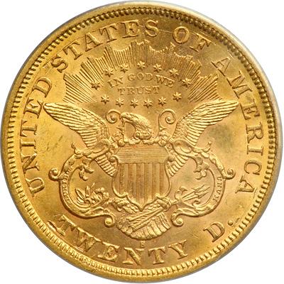 1875-S $20 Liberty. PCGS graded MS-62. CAC Approved. Well struck with remarkably clean surfaces for this numerical grade, thus a Premium Quality coin in addition to the CAC green label. Lovely golden toning adds to its appeal. To say this is an exciting example of this issue with highly lustrous and frosty yellow gold surfaces would be stating the obvious. For it has exceptional aesthetic appeal. Sharply struck with strong obverse and reverse design features. Close examination will reveal almost no abrasions. We note a single light mark below Liberty's eye and another by the first T in TWENTY on the reverse, however, a quick glance suggests a coin approaching a higher grade quality. If graded separately, the reverse of this example would easily qualify for finer than MS62. The reverse of this example has a small, bold mintmark centered over the right serif of N, and with intermittent cracks through the entire legend.
