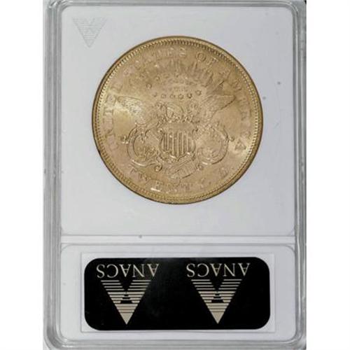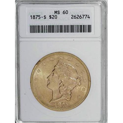 <B>1875-S $20 MS60 ANACS.</B></I> Peach-gold surfaces display pleasing luster for the grade, as well as nicely defined motifs. An evenly distributed number of light abrasions account for the grade.<BR><BR><b>Shipping:</b> Coins & Currency (<a target="_blank" href="http://www.heritageauctions.com/common/shipping.php">view shipping information</a>)