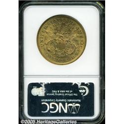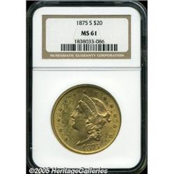 <B>1875-S $20 MS61 NGC.</B></I> A scuffy appearance on the rather moderately bagmarked surfaces, but the luster is good and frosty on both sides. Sharply struck with rich golden-orange coloration.