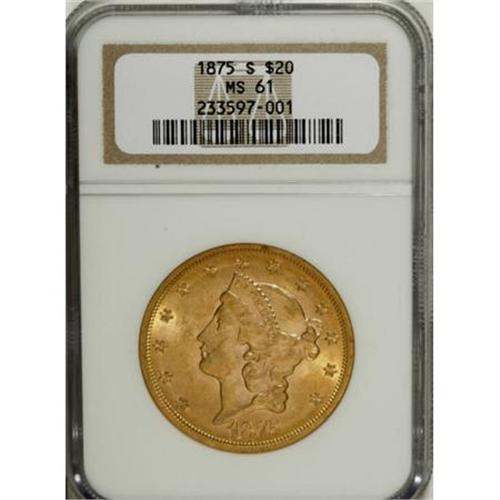 <B>1875-S $20 MS61 NGC.</B></I> Apricot-gold surfaces see some interruptions in the luster flow from the small contact marks scattered about. Most of the design elements are well struck up.<BR><BR><B>Coin Engraver:</B> James B. Longacre<BR><BR><b>Shipping:</b> Coins & Currency (<a target="_blank" href="http://www.heritageauctions.com/common/shipping.php">view shipping information</a>\)