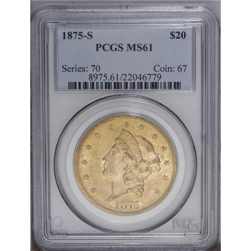 <B>1875-S $20 MS61 PCGS.</B></I> Deep red-gold coloration adorns the bright, exceedingly frosty surfaces of this moderately marked example. Boldly struck, with just a few too many bagmarks to receive a higher grade designation. The '75-S double eagle becomes scarce in higher Mint State grades.