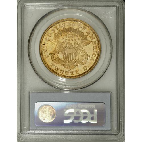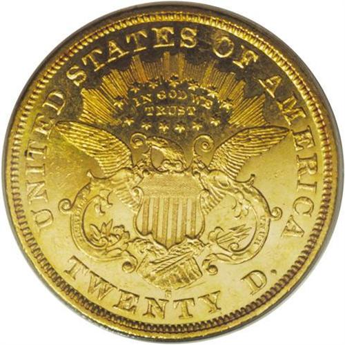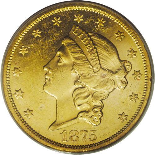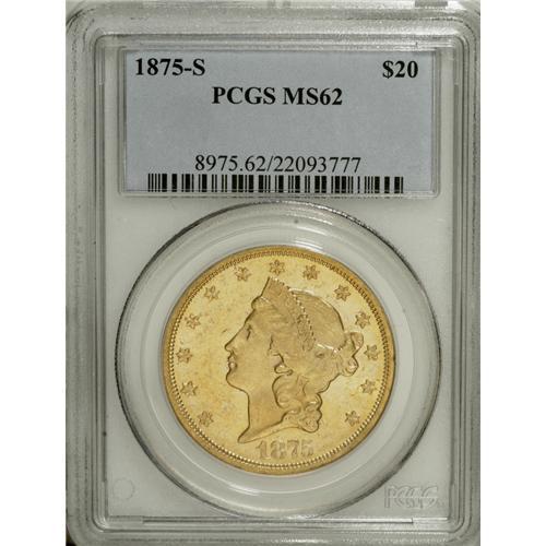 <B>1875-S $20 MS62 PCGS.</B></I> The majority of 1875-S double eagle survivors are in grades Very fine to About Uncirculated. Mint State pieces are available, but usually in MS60 or MS61. The population drops off significantly in MS62, and anything finer is rare. Prooflike fields on the MS62 specimen in this lot offers pleasing contrast with the motifs when the coin is tilted under a light source. Good definition prevails on the design features, and while the expected number of handling marks are visible, they are not overwhelming, and none are worthy of individual mention. Population: 84 in 62, 16 finer (2/07).<BR><BR><b>Shipping:</b> Coins & Currency (<a target="_blank" href="http://www.heritageauctions.com/common/shipping.php">view shipping information</a>)