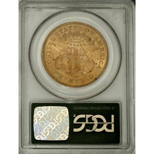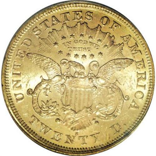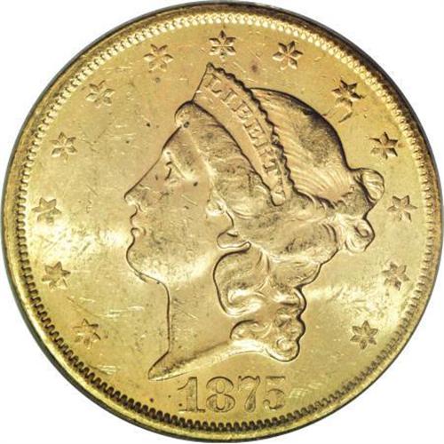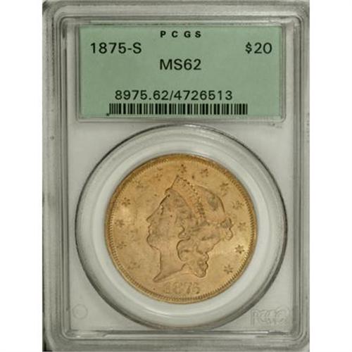 <B>1875-S $20 MS62 PCGS.</B></I> The 1875-S twenty is available in Mint State, but only in MS60 to MS62. Anything finer is elusive. Peach-gold lustrous surfaces of this MS62 coin reveal a scattering of grade-defining marks. The design elements are well impressed. Housed in a green-label holder. Population: 89 in 62, 16 finer (12/07).<BR><BR><B>Coin Engraver:</B> James B. Longacre<BR><BR><b>Shipping:</b> Coins & Currency (<a target="_blank" href="http://www.heritageauctions.com/common/shipping.php">view shipping information</a>)