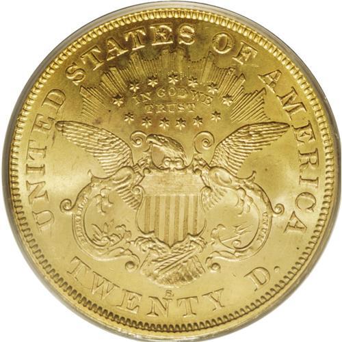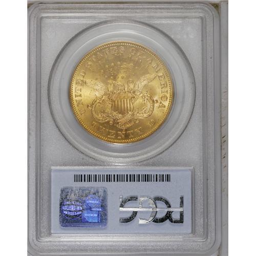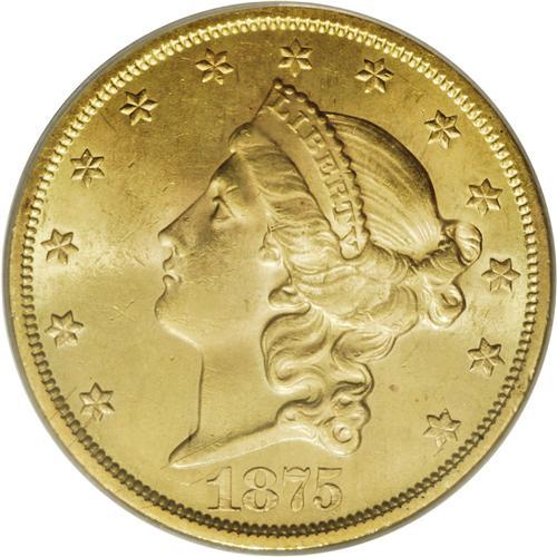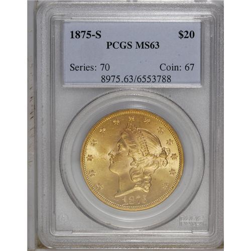 <B>1875-S $20 MS63 PCGS.</B></I> Sharply struck and fully lustrous with brilliant light yellow-gold color accented by traces of green. Following a common theme, this date is a condition rarity in MS63 quality, yet plentiful in lower Mint State grades. Almost 1,100 examples have been certified in grades from MS60 to MS62, but only 28 pieces have received higher grades, including a single remarkable MS67 grade coin. A few minor surface cuts are visible along the lower left obverse border, but all other aspects of this piece are splendid and choice. Population: 10 in 63, 6 finer (4/07).<BR><BR><b>Shipping:</b> Coins & Currency (<a target="_blank" href="http://www.heritageauctions.com/common/shipping.php">view shipping information</a>)
