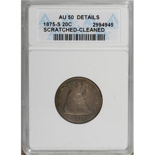 <B>1875-S 20C --Cleaned, Scratched--ANACS. AU50 Details.</B></I> NGC Census: (36/1513). PCGS Population (108/1679). Mintage: 1,155,000. Numismedia Wsl. Price for NGC/PCGS coin in AU50: $300. (#5298)<BR><BR><B>Coin Engraver:</B> William Barber<BR><BR><b>Shipping:</b> Coins & Currency (<a target="_blank" href="http://www.heritageauctions.com/common/shipping.php">view shipping information</a>)