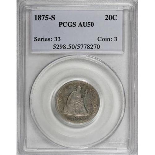 <B>1875-S 20C AU50 PCGS.</B></I> PCGS Population (109/1691). NGC Census: (37/1539). Mintage: 1,155,000. Numismedia Wsl. Price for NGC/PCGS coin in AU50: $300. (#5298)<BR><BR><B>Coin Engraver:</B> William Barber<BR><BR><b>Shipping:</b> Coins & Currency (<a target="_blank" href="http://www.heritageauctions.com/common/shipping.php">view shipping information</a>)