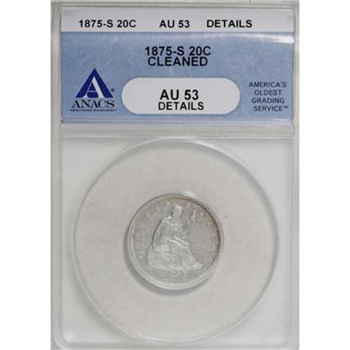 <B>1875-S 20C --Cleaned--ANACS. AU53 Details.</B></I> NGC Census: (38/1501). PCGS Population (69/1622). Mintage: 1,155,000. Numismedia Wsl. Price for NGC/PCGS coin in AU53: $335. (#5298)<BR><BR><B>Coin Engraver:</B> William Barber<BR><BR><b>Shipping:</b> Coins & Currency (<a target="_blank" href="http://www.heritageauctions.com/common/shipping.php">view shipping information</a>)