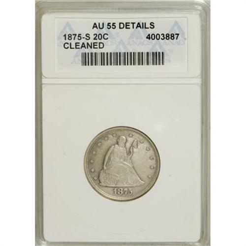 <B>1875-S 20C --Cleaned--ANACS. AU55 Details.</B></I> NGC Census: (90/1386). PCGS Population (132/1472). Mintage: 1,155,000. Numismedia Wsl. Price for NGC/PCGS coin in AU55: $360. (#5298)<BR><BR><B>Coin Engraver:</B> William Barber<BR><BR><b>Shipping:</b> Coins & Currency (<a target="_blank" href="http://www.heritageauctions.com/common/shipping.php">view shipping information</a>)