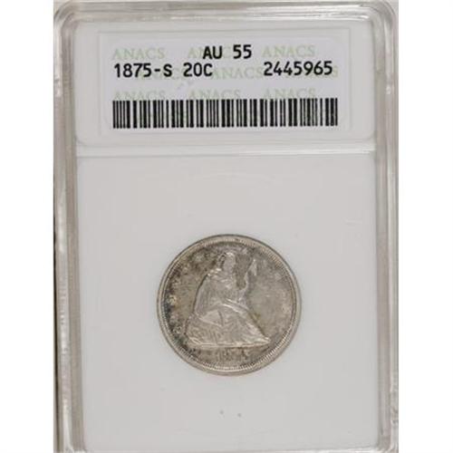 <B>1875-S 20C AU55 ANACS.</B></I> NGC Census: (93/1415). PCGS Population (135/1503). Mintage: 1,155,000. Numismedia Wsl. Price for NGC/PCGS coin in AU55: $400. (#5298)<BR><BR><B>Coin Engraver:</B> William Barber<BR><BR><b>Shipping:</b> Coins & Currency (<a target="_blank" href="http://www.heritageauctions.com/common/shipping.php">view shipping information</a>)