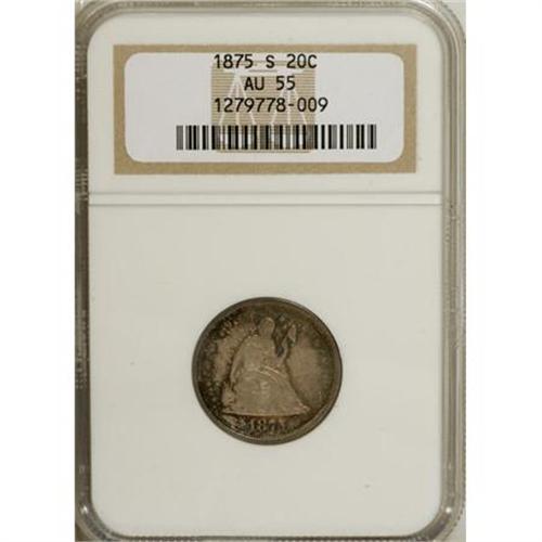 <B>1875-S 20C AU55 NGC.</B></I> NGC Census: (89/1379). PCGS Population (131/1454). Mintage: 1,155,000. Numismedia Wsl. Price for NGC/PCGS coin in AU55: $360. (#5298)<BR><BR><B>Coin Engraver:</B> William Barber<BR><BR><b>Shipping:</b> Coins & Currency (<a target="_blank" href="http://www.heritageauctions.com/common/shipping.php">view shipping information</a>\)