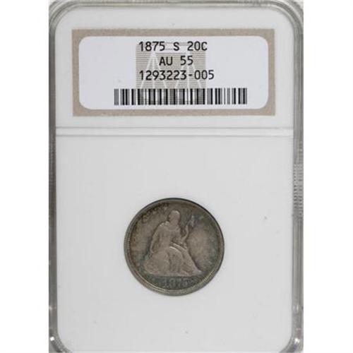 <B>1875-S 20C AU55 NGC.</B></I> NGC Census: (93/1417). PCGS Population (135/1499). Mintage: 1,155,000. Numismedia Wsl. Price for NGC/PCGS coin in AU55: $380. (#5298)<BR><BR><B>Coin Engraver:</B> William Barber<BR><BR><b>Shipping:</b> Coins & Currency (<a target="_blank" href="http://www.heritageauctions.com/common/shipping.php">view shipping information</a>)