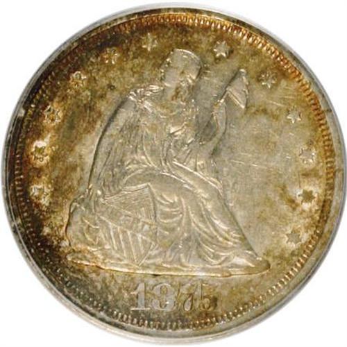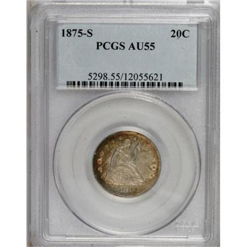 <B>1875-S 20C AU55 PCGS.</B></I> PCGS Population (134/1482). NGC Census: (90/1386). Mintage: 1,155,000. Numismedia Wsl. Price for NGC/PCGS coin in AU55: $360. (#5298)<BR><BR><B>Coin Engraver:</B> William Barber<BR><BR><b>Shipping:</b> Coins & Currency (<a target="_blank" href="http://www.heritageauctions.com/common/shipping.php">view shipping information</a>)