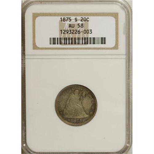 <B>1875-S 20C AU58 NGC.</B></I> NGC Census: (210/1169). PCGS Population (202/1252). Mintage: 1,155,000. Numismedia Wsl. Price for NGC/PCGS coin in AU58: $400. (#5298)<BR><BR><B>Coin Engraver:</B> William Barber<BR><BR><b>Shipping:</b> Coins & Currency (<a target="_blank" href="http://www.heritageauctions.com/common/shipping.php">view shipping information</a>\)