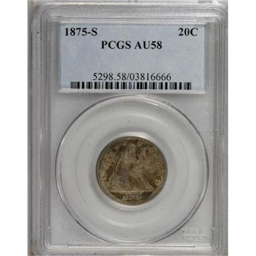 <B>1875-S 20C AU58 PCGS.</B></I> PCGS Population (206/1269). NGC Census: (210/1176). Mintage: 1,155,000. Numismedia Wsl. Price for NGC/PCGS coin in AU58: $400. (#5298)<BR><BR><B>Coin Engraver:</B> William Barber<BR><BR><b>Shipping:</b> Coins & Currency (<a target="_blank" href="http://www.heritageauctions.com/common/shipping.php">view shipping information</a>)