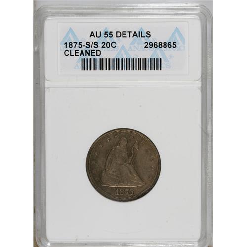 <B>1875-S/S 20C --Cleaned--ANACS. AU55 Details.</B></I> NGC Census: (88/1372). PCGS Population (129/1445). Mintage: 1,155,000. Numismedia Wsl. Price for NGC/PCGS coin in AU55: $354. (#5298)<BR><BR><b>Shipping:</b> Coins & Currency (<a target="_blank" href="http://www.heritageauctions.com/common/shipping.php">view shipping information</a>)