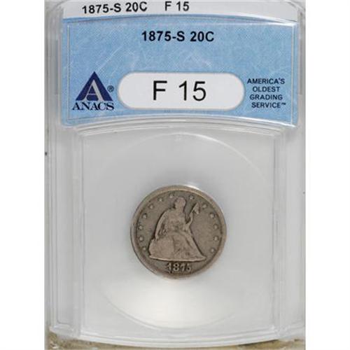 <B>1875-S 20C F15 ANACS.</B></I> NGC Census: (6/1712). PCGS Population (19/2073). Mintage: 1,155,000. Numismedia Wsl. Price for NGC/PCGS coin in F15: $127. (#5298)<BR><BR><B>Coin Engraver:</B> William Barber<BR><BR><b>Shipping:</b> Coins & Currency (<a target="_blank" href="http://www.heritageauctions.com/common/shipping.php">view shipping information</a>)