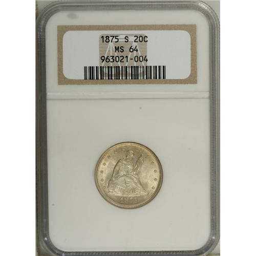 <B>1875-S 20C MS64 NGC.</B></I> An exciting example of this short-lived denomination that was basically struck for use in the West for political, not practical reasons. The frosty surfaces are bathed in russet-gold toning across both sides. The coin has excellent eye appeal to go along with the wonderful story of its origin and demise. An excellent representative of the type.<BR><BR><b>Shipping:</b> Coin/Currency (<a target="_blank" href="http://www.heritageauctions.com/common/shipping.php">view shipping information</a>)