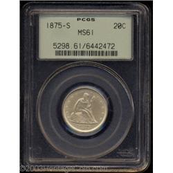 <TABLE cellSpacing=0 cellPadding=0 width="100%" bgColor=#000000 border=0><TBODY><TR><TD width="100%"><TABLE cellSpacing=1 cellPadding=3 width="100%" border=0><TBODY><TR><TD width="100%" bgColor=#79735c><FONT face=arial color=#ffffff size=3><B>Description</B> </FONT></TD></TR><TR><TD width="100%" bgColor=#ffffff><FONT face=arial size=2><B>1875-S 20C MS61 PCGS.</B></I> MPD-002. The 8 in the date is misplaced within the denticles. A sharply struck piece with medium apricot patina and no obtrusive abrasions. The reverse has several relatively heavy die cracks, as made. </FONT></TD></TR></TBODY></TABLE></TD></TR></TBODY></TABLE><BR><A name=PricesRealized></A><TABLE cellSpacing=0 cellPadding=0 width="100%" bgColor=#000000 border=0><TBODY><TR><TD width="100%"><TABLE cellSpacing=1 cellPadding=3 width="100%" border=0><TBODY><TR><TD width="100%" bgColor=#79735c><A name=PR><FONT face=arial color=#ffffff size=3><B>Previous Prices from Heritage Auctions</B> </FONT></A></TD></TR><TR><TD bgColor=#f6f6ed><TABLE cellSpacing=0 cellPadding=0 width="100%" border=1><TBODY><TR><TD align=middle width="33%"><B>Date</B></TD><TD align=middle width="33%"><B>Service</B></TD><TD align=middle width="33%"><B>Price</B></TD></TR><TR bgColor=whitesmoke><TD width="33%"><B>08/13/1996</B></TD><TD width="33%">NGC</TD><TD width="33%">$330.00</TD></TR><TR bgColor=whitesmoke><TD width="33%"><B>01/13/2002</B></TD><TD width="33%">ANACS</TD><TD width="33%">$368.00</TD></TR><TR bgColor=whitesmoke><TD width="33%"><B>10/06/2001</B></TD><TD width="33%">ANACS</TD><TD width="33%">$345.00</TD></TR><TR bgColor=whitesmoke><TD width="33%"><B>01/04/1996</B></TD><TD width="33%">PCGS</TD><TD width="33%">$396.00</TD></TR><TR bgColor=whitesmoke><TD width="33%"><B>02/11/2003</B></TD><TD width="33%">NGC</TD><TD width="33%">$414.00</TD></TR><TR bgColor=whitesmoke><TD width="33%"><B>09/24/1999</B></TD><TD width="33%">ANACS</TD><TD width="33%">$460.00</TD></TR><TR bgColor=whitesmoke><TD width="33%"><B>07/29/2003</B></TD><TD width="33%">ANACS</TD><TD width="33%">$437.00</TD></TR></TBODY></TABLE></TD></TR><TR><TD bgColor=#ffffff><FONT face=arial size=1 ?>PLEASE NOTE: All prices realized reflect the final hammer price PLUS the buyer's premium in auctions that charge a buyer's premium. Each item has a notation at the top of the listing indicating whether that lot included a buyer's premium. Example: A item that sells with a final hammer price of $100 and a 20% buyer's premium will display with a price realized of $120. All information listed is intended to be as accurate as possible, but errors are possible. Please use this guide carefully and inform us of any inaccuracies. </FONT></TD></TR></TBODY></TABLE></TD></TR></TBODY></TABLE><BR><TABLE cellSpacing=0 cellPadding=0 width="100%" bgColor=#000000 border=0><TBODY><TR><TD width="100%"><TABLE cellSpacing=1 cellPadding=3 width="100%" border=0><TBODY><TR><TD width="100%" bgColor=#79735c colSpan=6><FONT face=arial color=#ffffff size=3><B>Price Guide*</B> </FONT></TD></TR><TR bgColor=#f6f6ed><TD align=middle><B>Grade</B> </TD><TD align=middle><B>Coin World<BR>(Trends)</B> </TD><TD align=middle><B>Numismedia<BR>Retail</B> </TD><TD align=middle><B>Numismedia<BR>Wholesale</B> </TD><TD align=middle><B>Coin<BR>Universe</B> </TD><TD align=middle><B>Heritage<BR>Value Index</B> </TD></TR><TR bgColor=#ffffff><TD align=middle>60</TD><TD align=right>$800.00</TD><TD align=right>$485.00</TD><TD align=right>$404.00</TD><TD align=right>$525.00</TD><TD align=right>$421.25</TD></TR><TR style="FONT-WEIGHT: bold" bgColor=#cccfdd><TD align=middle>61</TD><TD align=right>---</TD><TD align=right>$530.00</TD><TD align=right>$442.00</TD><TD align=right>$575.00</TD><TD align=right>$500.00</TD></TR><TR bgColor=#ffffff><TD align=middle>62</TD><TD align=right>$1,000.00</TD><TD align=right>$630.00</TD><TD align=right>$500.00</TD><TD align=right>---</TD><TD align=right>$599.38</TD></TR><TR bgColor=#ffffff><TD colSpan=6><FONT size=1>*All information listed is intended to be as accurate as possible, but errors are possible. No item may be returned or refused based on this information which is provided as a service to our customers. You should contact each pricing source directly to determine the accuracy of this information. </FONT></TD></TR></TBODY></TABLE></TD></TR></TBODY></TABLE><BR><TABLE cellSpacing=0 cellPadding=0 width="100%" bgColor=#000000 border=0><TBODY><TR><TD width="100%"><TABLE cellSpacing=1 cellPadding=3 width="100%" border=0><TBODY><TR><TD width="100%" bgColor=#79735c><FONT face=arial color=#ffffff size=3><B>Population Guide</B> </FONT></TD></TR><TR bgColor=#ffffff><TD align=middle><!-- Begin Output of Population Grid--><TABLE cellSpacing=0 cellPadding=0 width="100%" border=0><TBODY><TR><TD vAlign=center><TABLE cellSpacing=0 width="100%" border=1 cellsadding="3"><TBODY><TR><TD vAlign=center><TABLE cellSpacing=0 cellPadding=3 width="100%" border=1><TBODY><TR><TD vAlign=center align=middle bgColor=#f0f1e8 colSpan=2 <CENTER><FONT face=Arial size=2><B>PCGS Pop </B></FONT><CENTER></CENTER></TD><TD vAlign=center align=middle bgColor=#f0f1e8 colSpan=2><CENTER><FONT face=Arial size=2><B>NGC Pop</B></CENTER></FONT></TD></TR><TR><TD vAlign=center><FONT face=Arial size=2>(61)</FONT> </TD><TD vAlign=center align=right><FONT face=Arial size=2>70</FONT> </TD><TD vAlign=center><FONT face=Arial size=2>(61)</FONT> </TD><TD vAlign=center align=right><FONT face=Arial size=2>59</FONT> </TD></TR><TR><TD vAlign=center><FONT face=Arial size=2>(>61)</FONT> </TD><TD vAlign=center align=right><FONT face=Arial size=2>984</FONT> </TD><TD vAlign=center><FONT face=Arial size=2>(>61)</FONT> </TD><TD vAlign=center align=right><FONT face=Arial size=2>833</FONT> </TD></TR></TBODY></TABLE></TD></TR></TBODY></TABLE></TD></TR></TBODY></TABLE><!-- End Output of Population Grid--> Important notice: Heritage usually auctions material at the rate of 200-250 lots per hour. On some occasions eBay Live bid software or the Internet may not be able to keep up with the p