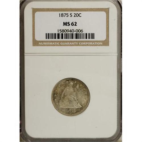 <B>1875-S 20C MS62 NGC.</B></I> An unworn, solidly struck representative of this definitive twenty cents type issue. The dusky surfaces have a blend of silver-gray and tan patina with dots of deeper crimson.<BR><I>From The Laguna Niguel Collection, Part Two.</B></I><BR><BR><B>Coin Engraver:</B> William Barber<BR><BR><b>Shipping:</b> Coins & Currency (<a target="_blank" href="http://www.heritageauctions.com/common/shipping.php">view shipping information</a>)