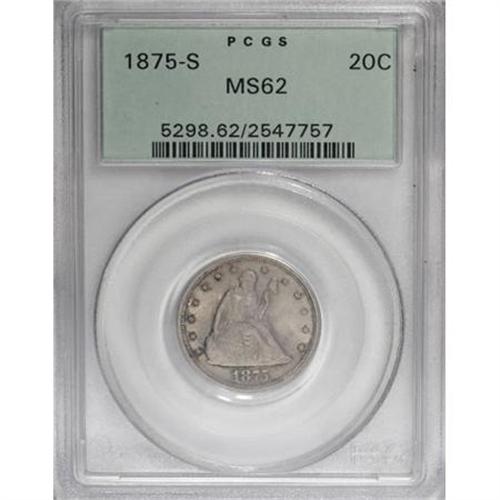 <B>1875-S 20C MS62 PCGS.</B></I> FS-302. The popular Misplaced Date variety that also features a nicely repunched mintmark. A lustrous example with fewer blemishes than expected of the grade. Toned in medium chestnut and russet shades. Encapsulated in a green label holder.<BR><BR><B>Coin Engraver:</B> William Barber<BR><BR><b>Shipping:</b> Coins & Currency (<a target="_blank" href="http://www.heritageauctions.com/common/shipping.php">view shipping information</a>)