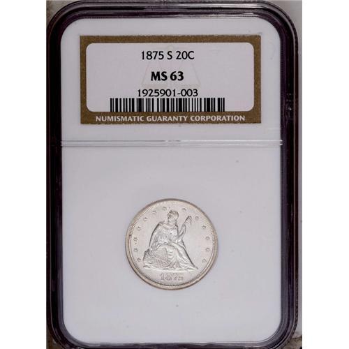 <B>1875-S<20C> MS63 NGC.</B></I> This untoned example is not excessively abraded, and the luster is brilliant and coruscant overall. Well struck for the type, especially in the centers.