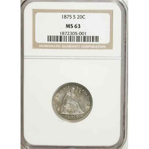 <B>1875-S 20C MS63 NGC.</B></I> A sharply struck and lustrous type coin with peripheral apple-green and russet toning. Pleasing for the grade with only a few insignificant obverse hairlines.<BR><I>From The Nick-A-Jack Collection.</B></I><BR><BR><B>Coin Engraver:</B> William Barber<BR><BR><b>Shipping:</b> Coins & Currency (<a target="_blank" href="http://www.heritageauctions.com/common/shipping.php">view shipping information</a>)