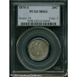 1875-S 20C MS63 PCGS. Somewhat softly struck with <B>1875-S 20C MS63 PCGS.</B></I> Somewhat softly struck with an extensive amount of drab, mottled patina on both sides. With typical satiny luster, no contact marks or abrasions, and a large grease streak (as struck) that extends from the lower right reverse rim to the top of the eagle's right (facing) wing. <BR><BR><B>Important notice:</B> Heritage usually auctions material at the rate of 200-250 lots per hour. On some occasions eBay Live bid software or the Internet may not be able to keep up with the pace of the auction. We recommend placing a realistic absentee bid now as insurance to avoid disappointment. Occasionally the auctioneer may eliminate or reject an eBay Live bid, and the auctioneer may also reopen a lot after the close of the eBay live bidding (usually because we missed an audience bid), and may reject your bid even if it shows you as the winning bidder. By bidding via eBay Live, you agree that Heritage may award the lot to another bidder at its sole discretion under the circumstances described above or any other reasonable circumstances. Since eBay bids are not shown to us until we open the lot on the floor, we treat those bids just like floor bids. In most cases the floor responds before the eBay bid is presented to us, due to Internet lag time, so for consistency we have made it a policy that floor bids are always considered first over tie eBay live bids. Also please note that all Heritage lots purchased through eBay Live carry a 20% Buyer's Premium. Please make sure you read the Terms and Conditions before you bid. This lot is being auctioned in conjunction with a live floor auction by Heritage Galleries & Auctioneers. All final auction and invoice information will be supplied by Heritage Galleries & Auctioneers, and all other information should be considered preliminary. Lot:5867