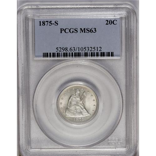 <B>1875-S<20C> MS63 PCGS.</B></I> The perfect type coin for this short-lived denomination, lustrous with pale rose-gold toning on the reverse. The strike is slightly uneven, most notably on the stars, but this is a minor imperfection.