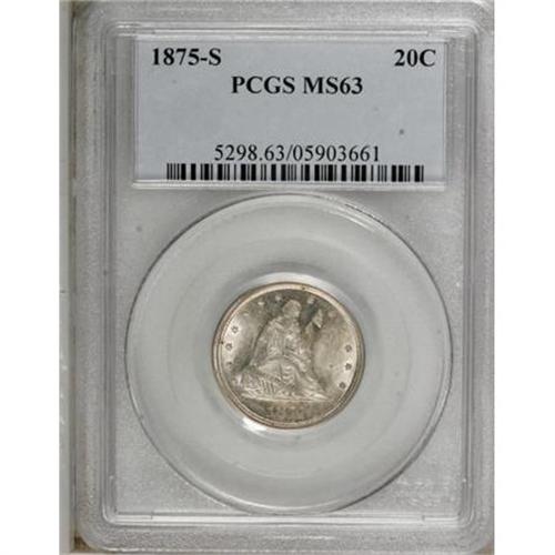 <B>1875-S 20C MS63 PCGS.</B></I> Well struck with swirling luster and a measure of flash. This Select type piece, predominantly silver-white with small splashes of olive toning, shows few marks for the grade.<BR><BR><B>Coin Engraver:</B> William Barber<BR><BR><b>Shipping:</b> Coins & Currency (<a target="_blank" href="http://www.heritageauctions.com/common/shipping.php">view shipping information</a>)