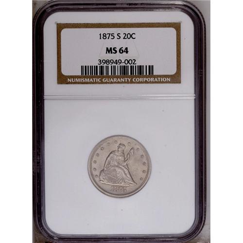 <B>1875-S 20C MS64 NGC.</B></I> Bright and original with satiny surfaces, a hint of light golden patina, and a bold strike. Certainly, a near-Gem example of this short-lived type.