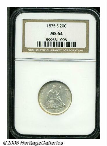 <B>1875-S<20C> MS64 NGC.</B></I> MPD-005. Crisply struck save for the mintmark, this lustrous and gently toned type coin has pleasantly unmarked surfaces. The centers exhibit faint mint-made clash marks.
