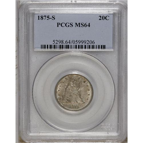 <B>1875-S 20C MS64 PCGS.</B></I> Lustrous beneath thick lilac and violet patina that covers each side. Solidly struck with a few light marks in the fields that define the grade.<BR><BR><b>Shipping:</b> Coin/Currency (<a target="_blank" href="http://www.heritageauctions.com/common/shipping.php">view shipping information</a>)