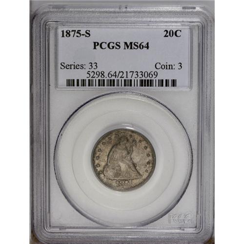 <B>1875-S<20C> MS64 PCGS.</B></I> Speckled gunmetal and reddish-brown toning liberally coats each side. The strike is particularly sharp for an 1875-S and only a few old pinscratches about star 13 keep this wholly original example from potential Gem status.