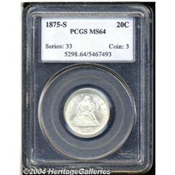 <B>1875-S<20C> MS64 PCGS.</B></I> Fairly well struck save for the top of the eagle's left (facing) wing, this nearly untoned specimen shows no significant contact marks. The reverse exhibits strong die polish lines (as made), as this specimen was probably one of the first pieces struck from recently polished reverse dies. <BR><BR><B>Important notice:</B> Heritage usually auctions material at the rate of 200-250 lots per hour. On some occasions eBay Live bid software or the Internet may not be able to keep up with the pace of the auction. We recommend placing a realistic absentee bid now as insurance to avoid disappointment. Occasionally the auctioneer may eliminate or reject an eBay Live bid, and the auctioneer may also reopen a lot after the close of the eBay live bidding (usually because we missed an audience bid), and may reject your bid even if it shows you as the winning bidder. By bidding via eBay Live, you agree that Heritage may award the lot to another bidder at its sole discretion under the circumstances described above or any other reasonable circumstances. Since eBay bids are not shown to us until we open the lot on the floor, we treat those bids just like floor bids. In most cases the floor responds before the eBay bid is presented to us, due to Internet lag time, so for consistency we have made it a policy that floor bids are always considered first over tie eBay live bids. Also please note that all Heritage lots purchased through eBay Live carry a 20% Buyer's Premium. Please make sure you read the Terms and Conditions before you bid.