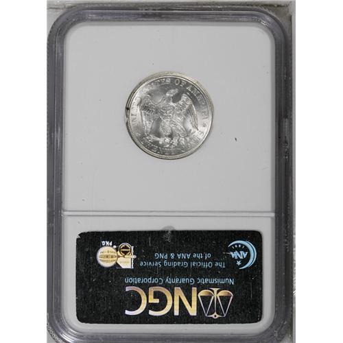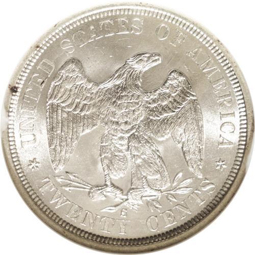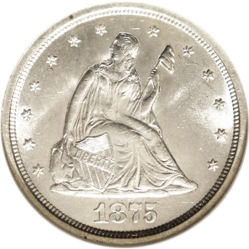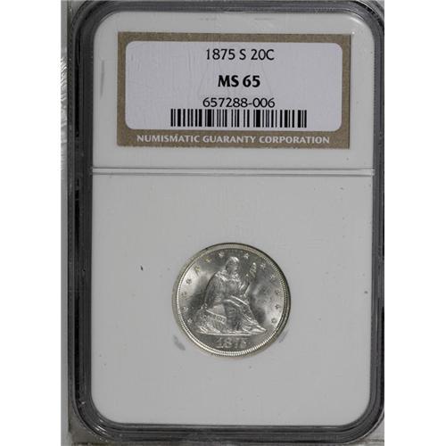 <B>1875-S<20C> MS65 NGC.</B></I> Breen-3875, Doubled "$" Mintmark; MPD-001, Blundered Date. Both dies are blundered. The top of a 5 is observed in the denticles below the 7 in the date. The mintmark is sharply recut, and exhibits two pairs of serifs. Multiple examples of this variety are included in the present sale. The top of the 5 buried in the denticles does not match the top of the 5 in the date, apparently from a different punch. This is a brilliant Gem with satiny silver luster and a few tiny spots of dark toning.