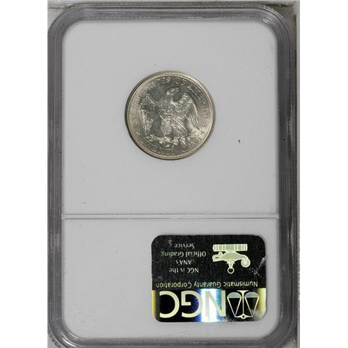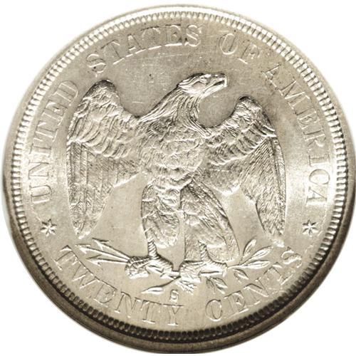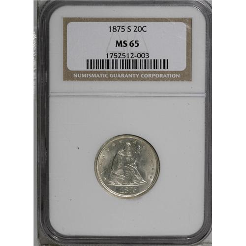 <B>1875-S<20C> MS65 NGC.</B></I> Breen-3875, Doubled "$" Mintmark; MPD-001, Blundered Date. Both dies are blundered. The top of a 5 is observed in the denticles below the 7 in the date. The mintmark is sharply recut, and exhibits two pairs of serifs. An intermediate die state of the variety with peripheral reverse die cracks joining many of the letters in the legend and denomination. This satiny Gem has brilliant silver luster with a trace of champagne toning.