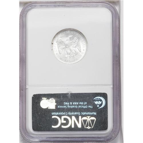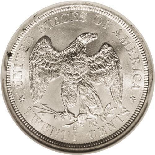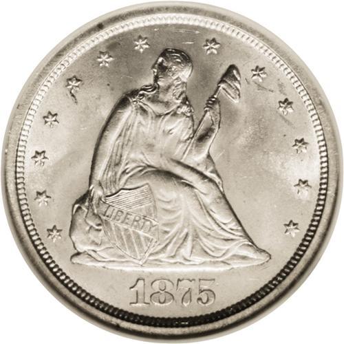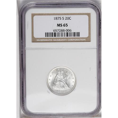 <B>1875-S<20C> MS65 NGC.</B></I> Breen-3875, Doubled "$" Mintmark; MPD-001, Blundered Date. Both dies are blundered. The top of a 5 is observed in the denticles below the 7 in the date. The mintmark is sharply recut, and exhibits two pairs of serifs. Multiple examples of this variety are included in the present sale. The top of the 5 buried in the denticles does not match the top of the 5 in the date, apparently from a different punch. This is a brilliant Gem with satiny silver luster and a few tiny spots of dark toning.