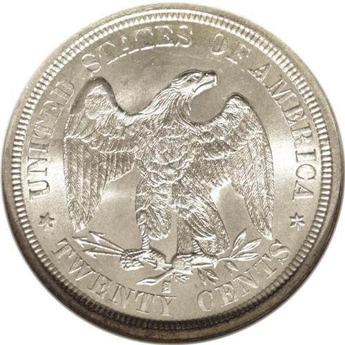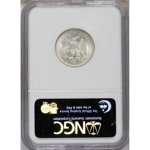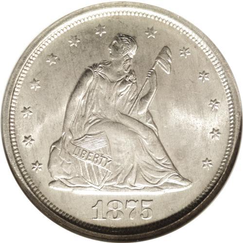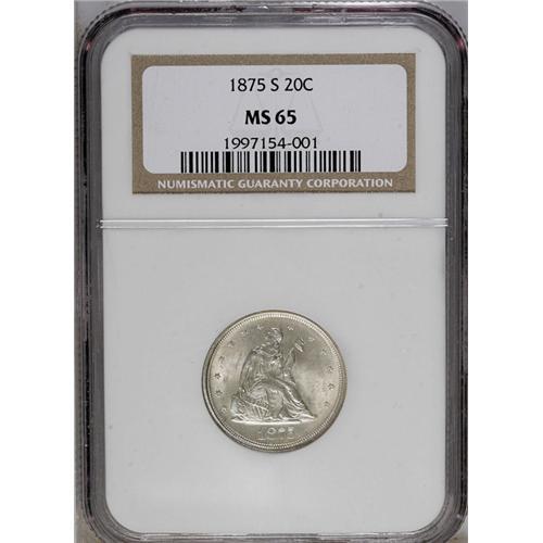 <B>1875-S<20C> MS65 NGC.</B></I> Normal Mintmark. This lovely Gem has creamy silver surfaces with a hint of gold color over ivory surfaces. Both sides are fully brilliant and lustrous. Stars 3 through 8 are mostly flat, and the upper left wing on the reverse is similarly weak, but all other details on both sides are sharp.