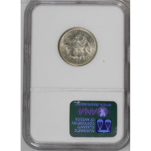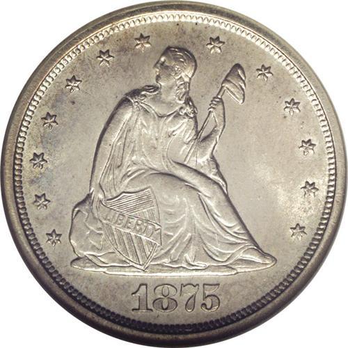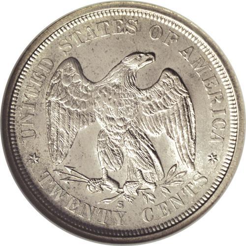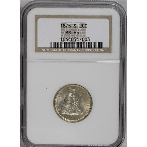 <B>1875-S<20C> MS65 NGC.</B></I> Rather well struck by the standards of this short-lived series, both sides are boldly, if not sharply detailed throughout. The mint luster is full and vibrant, and the surfaces are free of distracting handling marks. A light amount of mottled russet-gray patina can be discerned at certain light angles. While the 1875-S is the most plentiful twenty cent piece, Gems are scarce when compared to the number of high grade collectors in today's hobby.