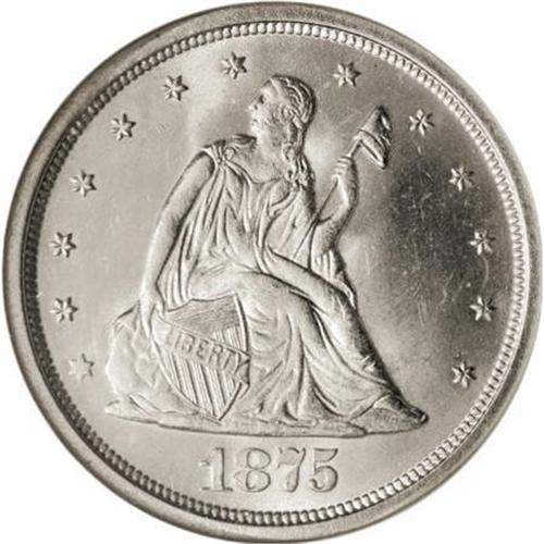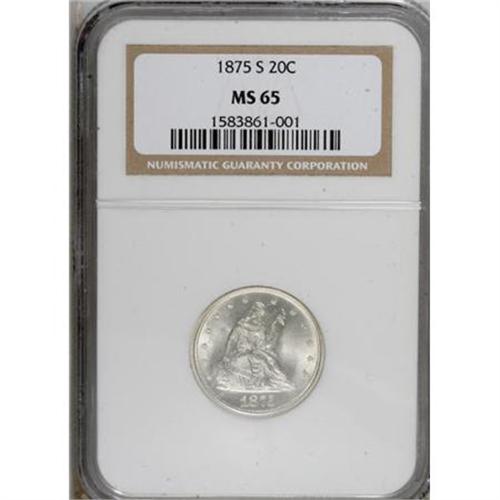 <B>1875-S 20C MS65 NGC.</B></I> Vibrant luster reaches out to the observer of this Gem twenty cent piece. The central devices possess a frosty finish that yields a rather pleasing contrast with the more smooth satiny fields. A well executed strike leaves its mark on the design elements, and untoned surfaces are devoid of all but a handful of minute grade consistent marks on the obverse.<BR><BR><B>Coin Engraver:</B> William Barber<BR><BR><b>Shipping:</b> Coins & Currency (<a target="_blank" href="http://www.heritageauctions.com/common/shipping.php">view shipping information</a>)