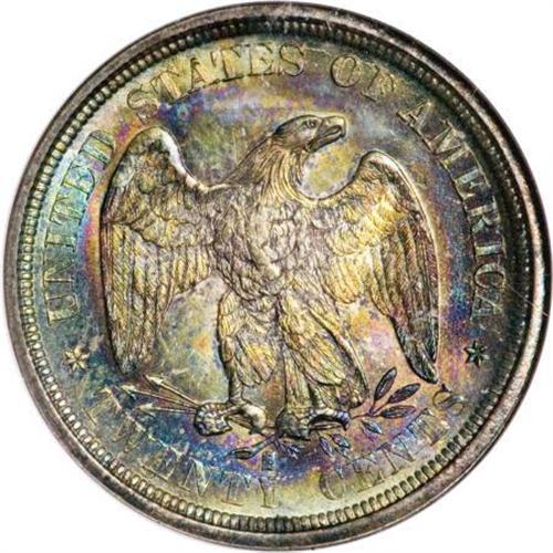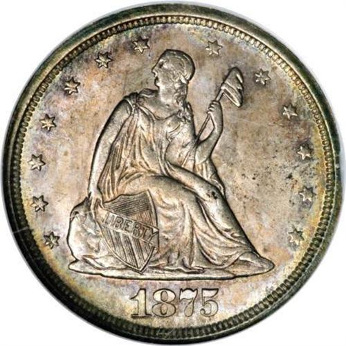 <B>1875-S 20C MS65 NGC.</B></I> MPD-003. The top of an 8 is misplaced within the denticles beneath the 8 in the date. This wonderful type Gem is mounted reverse-up in the holder, the better to display the vivid green-gold, azure, and magenta patina that graces that side. The subtle apricot and pearl-gray shadings of the obverse are also attractive. Satiny and well struck with powerful visual appeal.<BR><BR><B>Coin Engraver:</B> William Barber<BR><BR><b>Shipping:</b> Coins & Currency (<a target="_blank" href="http://www.heritageauctions.com/common/shipping.php">view shipping information</a>)