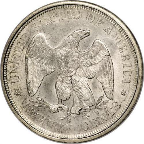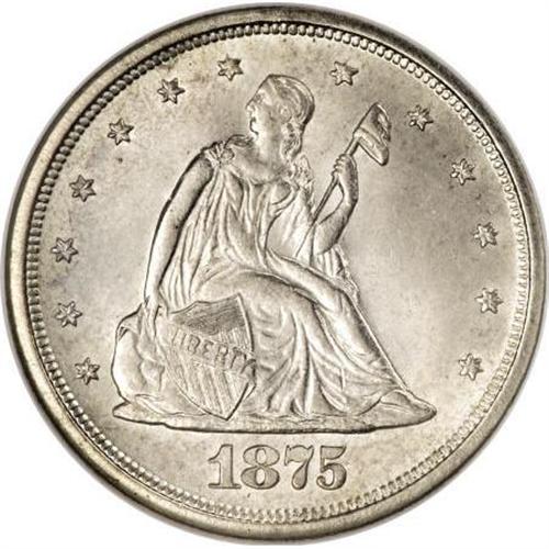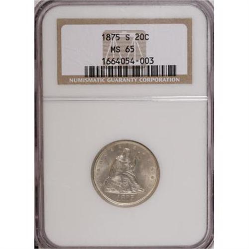 <B>1875-S 20C MS65 NGC.</B></I> FS-302. The mintmark is nicely repunched, and a date digit (the top of a 5) is misplaced in the dentils. Nicely struck by the standards of this short-lived type. The mint luster is comprehensive, and the surfaces are free of detectable marks. A light amount of mottled russet-gray patina can be discerned at certain light angles.<BR><BR><B>Coin Engraver:</B> William Barber<BR><BR><b>Shipping:</b> Coins & Currency (<a target="_blank" href="http://www.heritageauctions.com/common/shipping.php">view shipping information</a>)