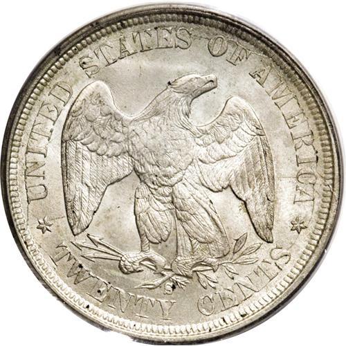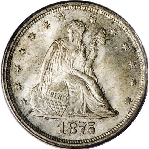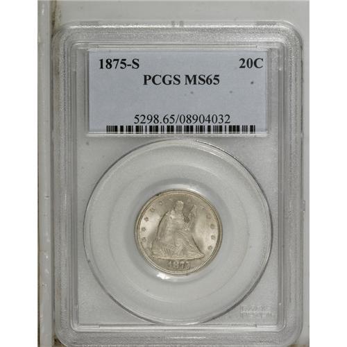 <B>1875-S 20C MS65 PCGS.</B></I> FS-20-1875S-302. The mintmark is repunched, and the top of an errant 5 is nestled within the denticles below the 7 in the date. A vibrant cartwheel sheen illuminates the delicate tawny-gold and dove-gray shadings. Liberty's hair and the peak of the left (facing) wing lack absolute detail, but the overall strike is bold, and the preservation is exemplary, even for the MS65 level.<BR><BR><b>Shipping:</b> Coins & Currency (<a target="_blank" href="http://www.heritageauctions.com/common/shipping.php">view shipping information</a>)