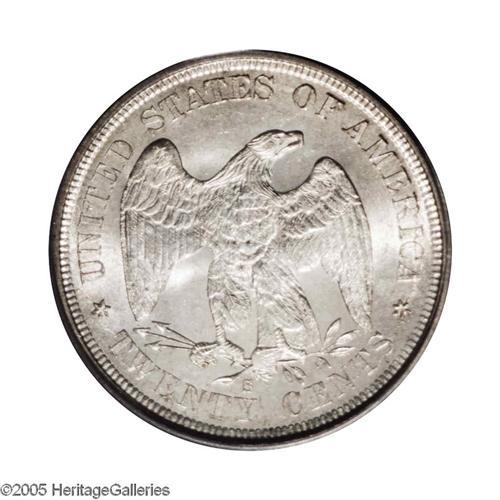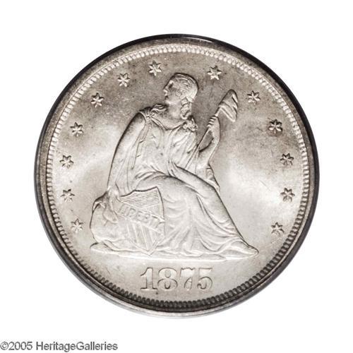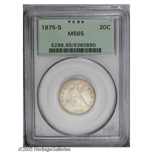 <B>1875-S<20C> MS65 PCGS.</B></I> Gentle golden-brown toning graces the borders of this highly lustrous and sharply struck type coin. Attractive, smooth surfaces confirm the quality. Unlike most 1875-S Twenty Cent Pieces, there is no sign of a date digit misplaced in the dentils. However, LIBERTY is lightly die doubled in an eastern direction. Encapsulated in a green label holder.