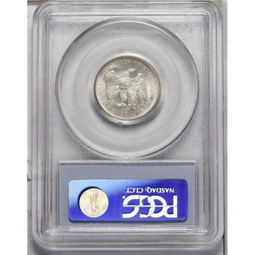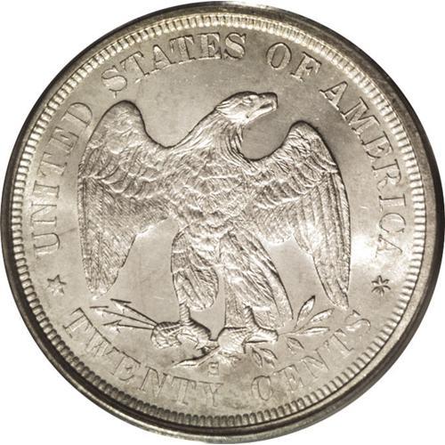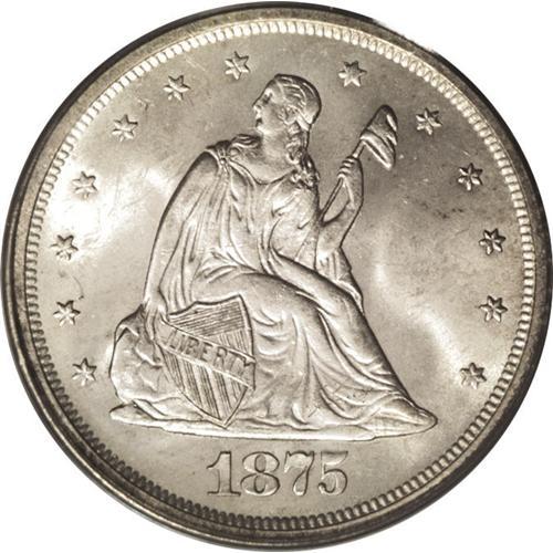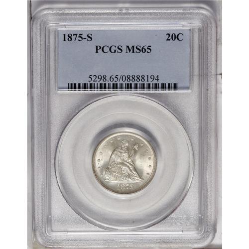 <B>1875-S<20C> MS65 PCGS.</B></I> Normal Mintmark. This is a lovely example with satiny silver surfaces and full mint brilliance. It is well defined with little weakness on either side. The upper obverse and lower reverse fall just short of a full strike. The top part of the left wing also shows slightly weak definition as usually encountered.