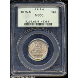 <table><tr><td><TABLE cellSpacing=0 cellPadding=0 width="100%" bgColor=#000000 border=0><TBODY> <TR><TD width="100%"><TABLE cellSpacing=1 cellPadding=3 width="100%" border=0><TBODY><TR><TD width="100%" bgColor=#79735c><FONT face=arial color=#ffffff size=3><B>Description</B> </FONT></TD></TR><TR><TD width="100%" bgColor=#ffffff><FONT face=arial size=2><B>1875-S 20C MS65 PCGS.</B></I> A highly lustrous example that is beautifully toned in shades of gray, rose, and lilac with only the slightest abrasions present in the right obverse field. Well defined over most of each side with occasional softness on the stars and the top of the eagle's left (facing) wing. A splendid, high grade type coin. </FONT></TD></TR></TBODY></TABLE></TD></TR></TBODY></TABLE><BR><A name=PricesRealized></A><TABLE cellSpacing=0 cellPadding=0 width="100%" bgColor=#000000 border=0><TBODY><TR><TD width="100%"><TABLE cellSpacing=1 cellPadding=3 width="100%" border=0><TBODY><TR><TD width="100%" bgColor=#79735c><A name=PR><FONT face=arial color=#ffffff size=3><B>Previous Prices from Heritage Auctions</B> </FONT></A></TD></TR><TR><TD bgColor=#f6f6ed><TABLE cellSpacing=0 cellPadding=0 width="100%" border=1><TBODY><TR><TD align=middle width="33%"><B>Date</B></TD><TD align=middle width="33%"><B>Service</B></TD><TD align=middle width="33%"><B>Price</B></TD></TR><TR bgColor=whitesmoke><TD width="33%"><B>03/01/2003</B></TD><TD width="33%">NGC</TD><TD width="33%">$2,990.00</TD></TR><TR bgColor=whitesmoke><TD width="33%"><B>07/30/2002</B></TD><TD width="33%">PCGS</TD><TD width="33%">$3,105.00</TD></TR><TR bgColor=whitesmoke><TD width="33%"><B>01/12/2002</B></TD><TD width="33%">PCGS</TD><TD width="33%">$2,587.50</TD></TR><TR bgColor=whitesmoke><TD width="33%"><B>08/08/2001</B></TD><TD width="33%">NGC</TD><TD width="33%">$2,875.00</TD></TR><TR bgColor=whitesmoke><TD width="33%"><B>06/02/2001</B></TD><TD width="33%">PCGS</TD><TD width="33%">$2,990.00</TD></TR><TR bgColor=whitesmoke><TD width="33%"><B>02/23/2001</B></TD><TD width="33%">PCGS</TD><TD width="33%">$3,335.00</TD></TR><TR bgColor=whitesmoke><TD width="33%"><B>08/07/2000</B></TD><TD width="33%">PCGS</TD><TD width="33%">$4,025.00</TD></TR><TR bgColor=whitesmoke><TD width="33%"><B>11/18/1999</B></TD><TD width="33%">NGC</TD><TD width="33%">$2,760.00</TD></TR><TR bgColor=whitesmoke><TD width="33%"><B>08/07/1999</B></TD><TD width="33%">NGC</TD><TD width="33%">$2,875.00</TD></TR><TR bgColor=whitesmoke><TD width="33%"><B>02/13/1998</B></TD><TD width="33%">PCGS</TD><TD width="33%">$4,400.00</TD></TR><TR bgColor=whitesmoke><TD width="33%"><B>01/10/1998</B></TD><TD width="33%">NGC</TD><TD width="33%">$2,645.00</TD></TR><TR bgColor=whitesmoke><TD width="33%"><B>06/01/1996</B></TD><TD width="33%">NGC</TD><TD width="33%">$3,740.00</TD></TR><TR bgColor=whitesmoke><TD width="33%"><B>05/29/1996</B></TD><TD width="33%">NGC</TD><TD width="33%">$1,100.00</TD></TR><TR bgColor=whitesmoke><TD width="33%"><B>08/19/1995</B></TD><TD width="33%">PCGS</TD><TD width="33%">$4,180.00</TD></TR><TR bgColor=whitesmoke><TD width="33%"><B>06/04/1995</B></TD><TD width="33%">NGC</TD><TD width="33%">$2,970.00</TD></TR><TR bgColor=whitesmoke><TD width="33%"><B>02/24/1995</B></TD><TD width="33%">PCGS</TD><TD width="33%">$3,300.00</TD></TR><TR bgColor=whitesmoke><TD width="33%"><B>03/04/1994</B></TD><TD width="33%">PCGS</TD><TD width="33%">$3,520.00</TD></TR><TR bgColor=whitesmoke><TD width="33%"><B>07/27/1993</B></TD><TD width="33%">PCGS</TD><TD width="33%">$4,950.00</TD></TR><TR bgColor=whitesmoke><TD width="33%"><B>02/01/1999</B></TD><TD width="33%">NGC</TD><TD width="33%">$3,450.00</TD></TR><TR bgColor=whitesmoke><TD width="33%"><B>03/01/1998</B></TD><TD width="33%">NGC</TD><TD width="33%">$3,190.00</TD></TR><TR bgColor=whitesmoke><TD width="33%"><B>09/01/1997</B></TD><TD width="33%">PCGS</TD><TD width="33%">$4,510.00</TD></TR><TR bgColor=whitesmoke><TD width="33%"><B>03/01/2001</B></TD><TD width="33%">NGC</TD><TD width="33%">$1,955.00</TD></TR><TR bgColor=whitesmoke><TD width="33%"><B>10/01/2001</B></TD><TD width="33%">NGC</TD><TD width="33%">$2,760.00</TD></TR><TR bgColor=whitesmoke><TD width="33%"><B>05/27/2001</B></TD><TD width="33%">PCGS</TD><TD width="33%">$2,990.00</TD></TR></TBODY></TABLE></TD></TR><TR><TD bgColor=#ffffff><FONT face=arial size=1 ?>PLEASE NOTE: All prices realized reflect the final hammer price PLUS the buyer's premium in auctions that charge a buyer's premium. Each item has a notation at the top of the listing indicating whether that lot included a buyer's premium. Example: A item that sells with a final hammer price of $100 and a 20% buyer's premium will display with a price realized of $120. All information listed is intended to be as accurate as possible, but errors are possible. Please use this guide carefully and inform us of any inaccuracies. </FONT></TD></TR></TBODY></TABLE></TD></TR></TBODY></TABLE><BR><TABLE cellSpacing=0 cellPadding=0 width="100%" bgColor=#000000 border=0><TBODY><TR><TD width="100%"><TABLE cellSpacing=1 cellPadding=3 width="100%" border=0><TBODY><TR><TD width="100%" bgColor=#79735c colSpan=6><FONT face=arial color=#ffffff size=3><B>Price Guide*</B> </FONT></TD></TR><TR bgColor=#f6f6ed><TD align=middle><B>Grade</B> </TD><TD align=middle><B>Coin World<BR>(Trends)</B> </TD><TD align=middle><B>Numismedia<BR>Retail</B> </TD><TD align=middle><B>Numismedia<BR>Wholesale</B> </TD><TD align=middle><B>Coin<BR>Universe</B> </TD><TD align=middle><B>Heritage<BR>Value Index</B> </TD></TR><TR bgColor=#ffffff><TD align=middle>64</TD><TD align=right>$2,000.00</TD><TD align=right>---</TD><TD align=right>$1,450.00</TD><TD align=right>$1,600.00</TD><TD align=right>$1,211.25</TD></TR><TR style="FONT-WEIGHT: bold" bgColor=#cccfdd><TD align=middle>65</TD><TD align=right>$4,500.00</TD><TD align=right>---</TD><TD align=right>$3,745.00</TD><TD align=right>$6,250.00</TD><TD align=right>$3,532.25</TD></TR><TR bgColor=#ffffff><TD align=middle>66</TD><TD align=right>$9,000.00</TD><TD align=ri
